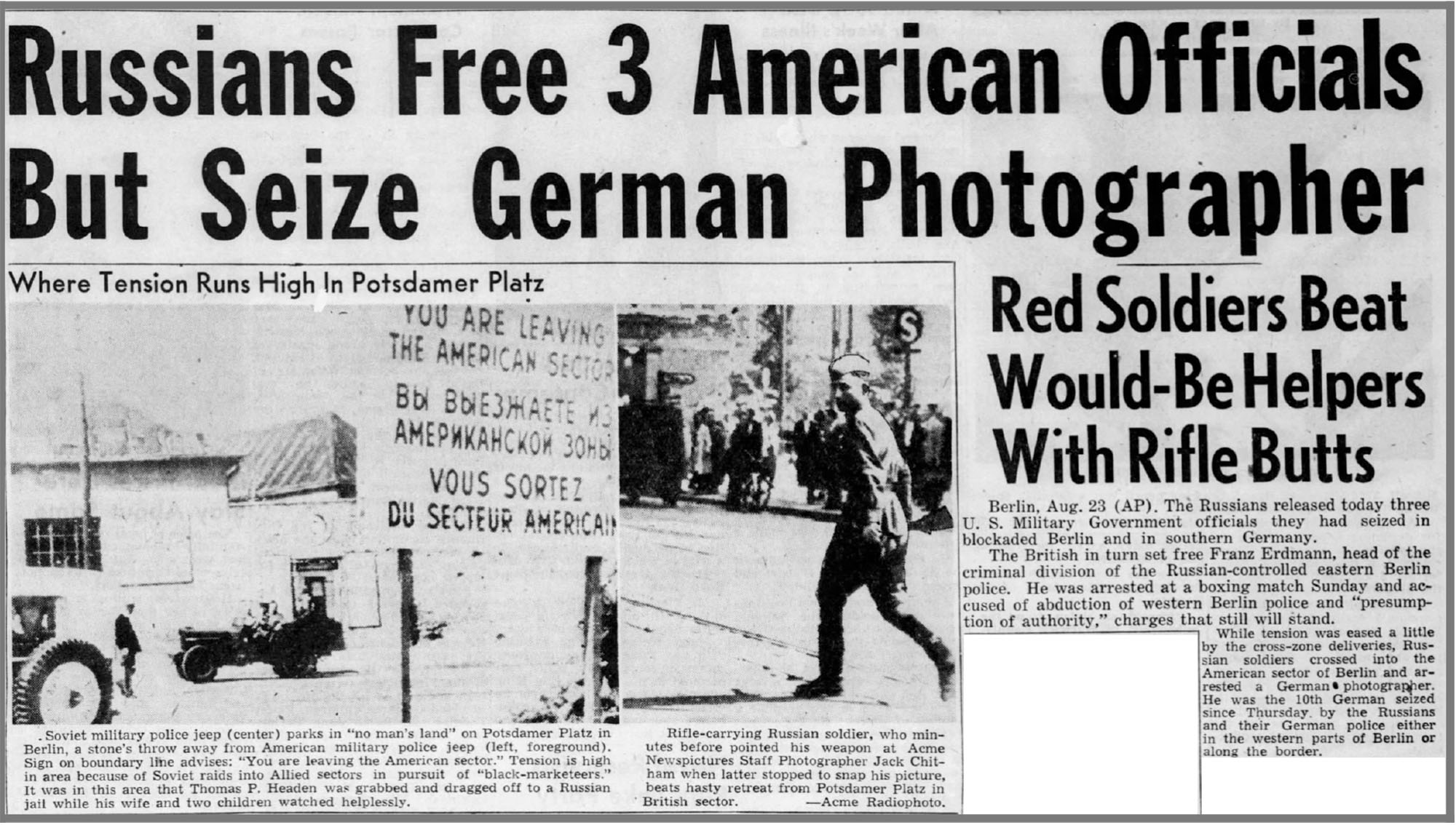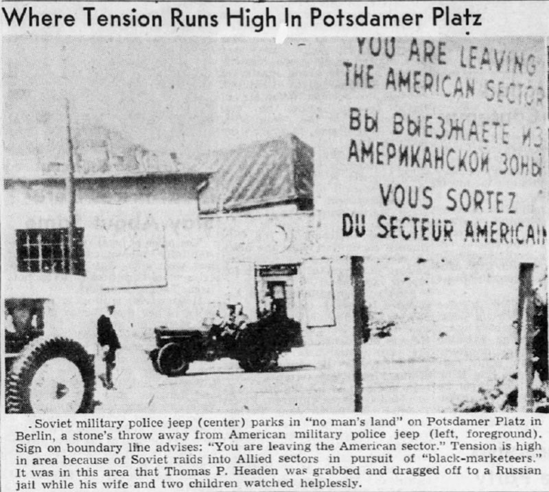 An August 23, 1948, article in the Tampa Times shared the news of an American and Soviet jeep standoff in Potsdamer Platz as tensions ran high between the East and West. I’d say tensions were high!