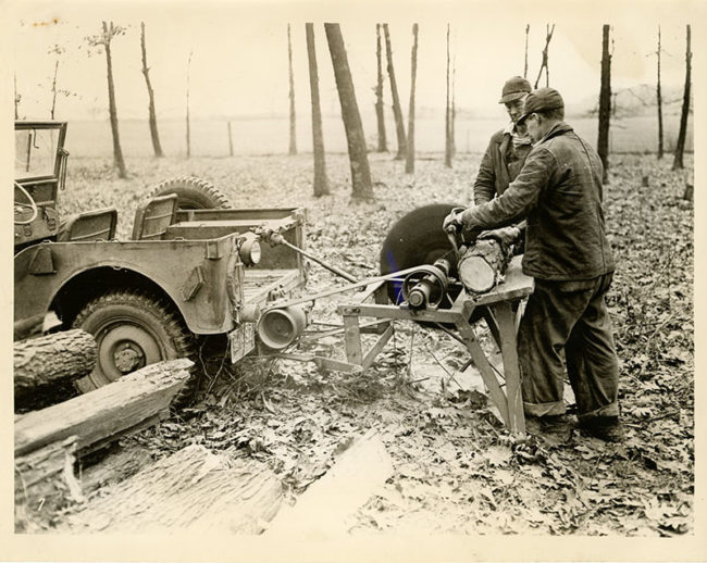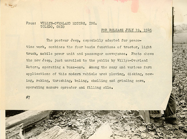 Photo #7 from the July 1945 Willys-Overland press kit shows a PTO powered mobile wood saw.