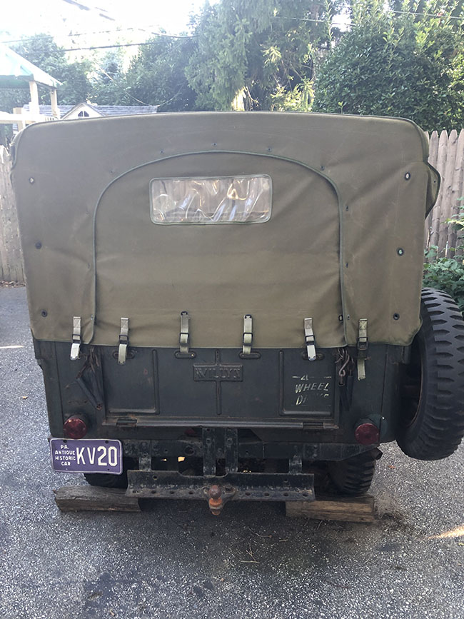 “1948 Willys CJ-2A with Beachwood Canvas summer top. Original body with original green paint. 12-volt conversion. Beachwood canvas upholstery. Rare rear seat. 30,922 miles.