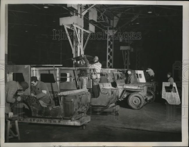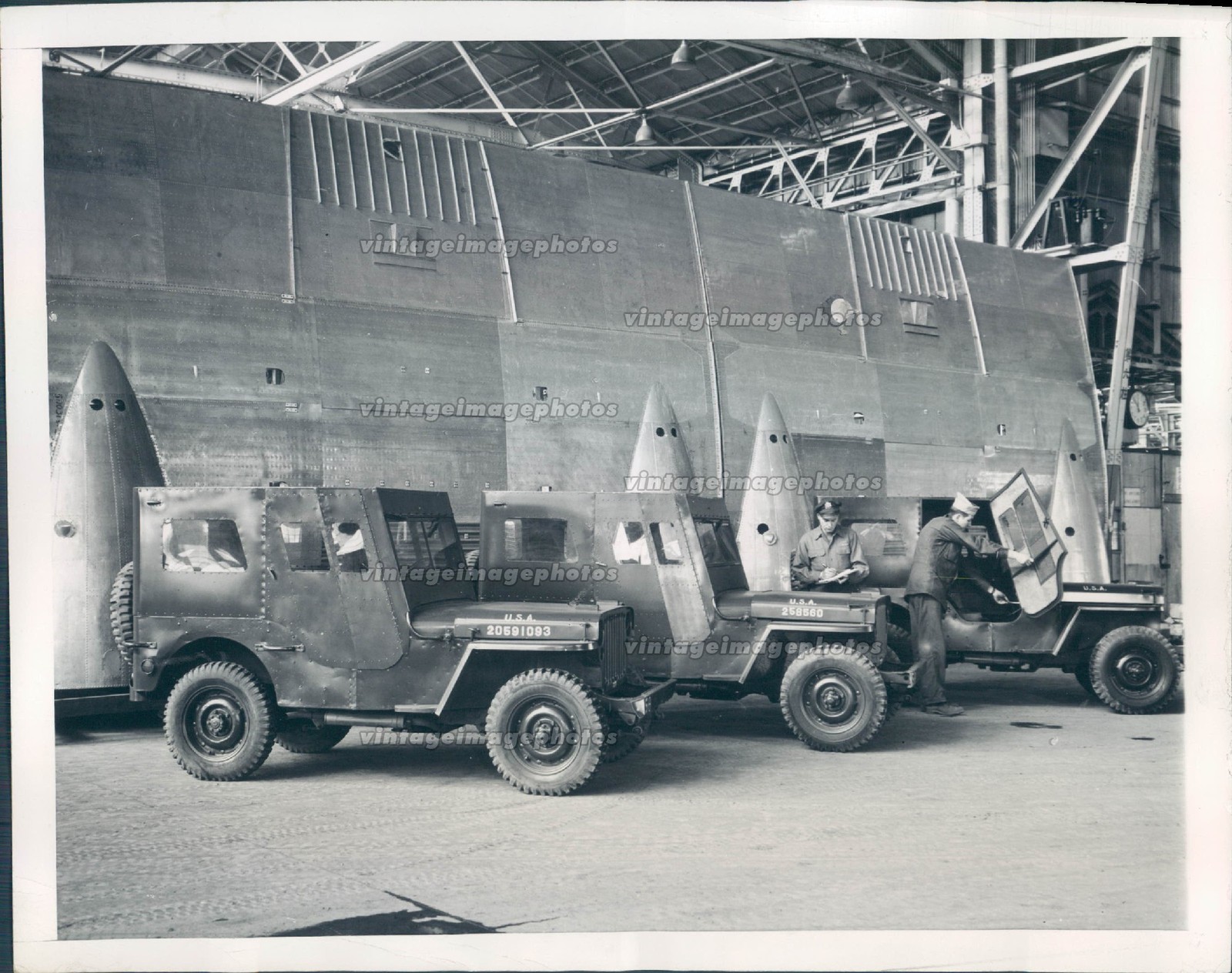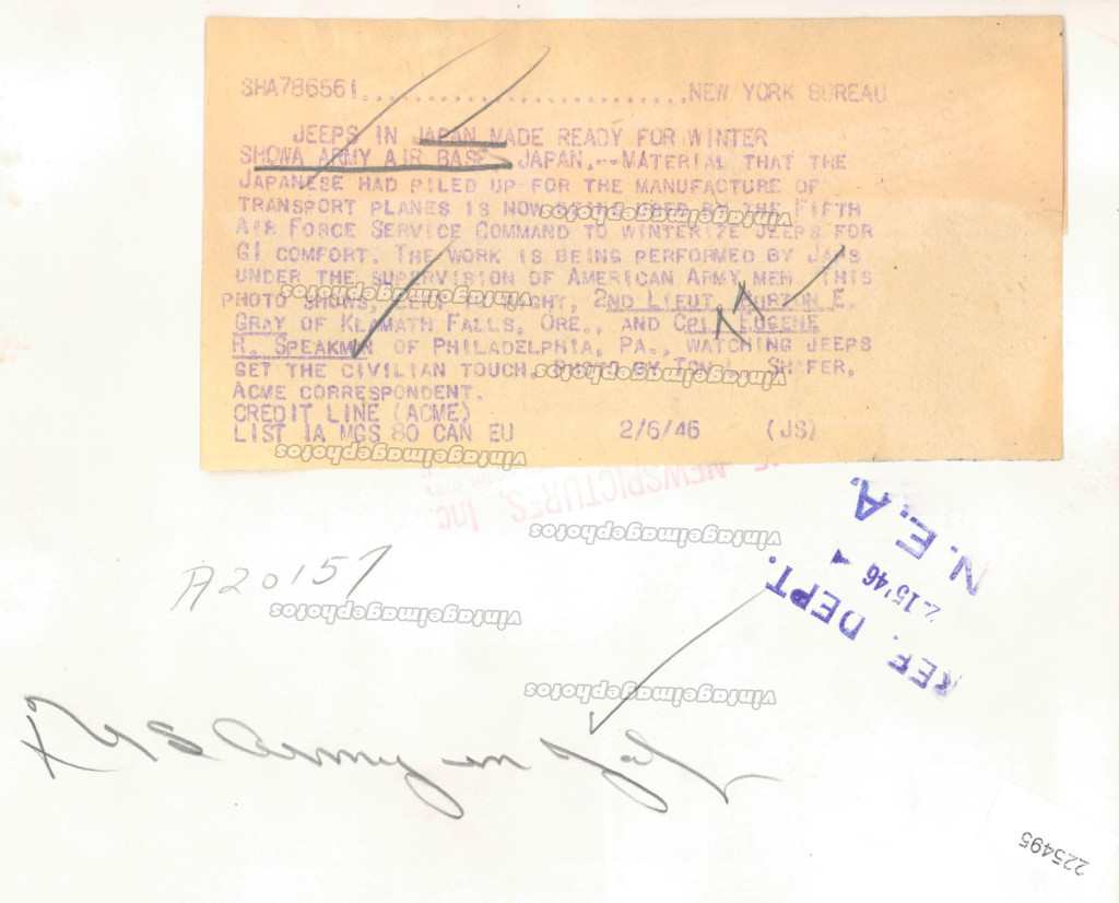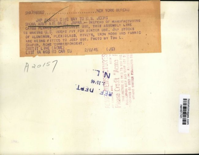 “This is an original press photo. Instead of manufacturing cargo planes for Japanese use, this assembly line is making US Jeeps fit for winter use. Japanese stocks of aluminum, plexiglass, rivets, iron rods and fabric are being fitted to jeep use. Photo measures 9.25 x 7 inches. Photo is dated 2-6-1946.”