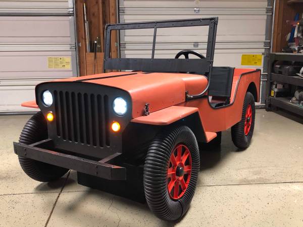 “This replica Jeep is 3/4 scale model loosely based on an early 40’s Willy’s Jeep. I built it for a prop for kids to play on at Vacation Bible School. The frame and body are wood construction plenty sturdy for kids (and small adults!) to sit in / play on. Tires are made of styrofoam, plastic lids, and irrigation drain pipe. No, it does not roll; it is stationary, although with a some imagination and skill you could modify it. There are headlights and marker lights in front connected to a 12v battery and switch in the dash.