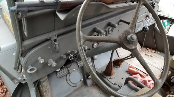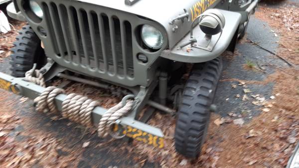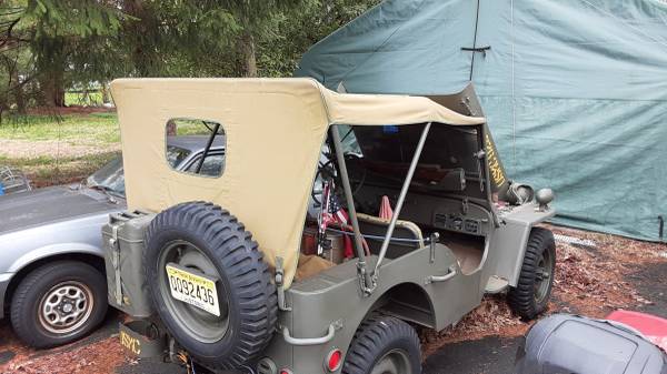 “This is a Ford GPW made in World War II for the U.S. military. An excellent condition jeep. It has a reproduction body, hood, grill, fenders, seats and canvas, tires and combat rims. But the frame, engine and many other parts are original and restored. The paint color and markings are for the USMC used in World War II. NO TITLE. Bill of Sale only.”