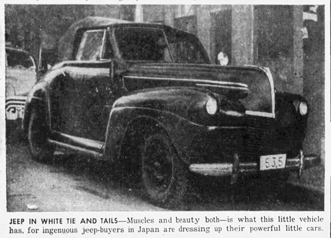 It’s too bad this photo isn’t sharper as I’d like to see if those are wheels and hubs truly look like they are from a jeep. It looks like that body fits the jeep chassis pretty well. This photo appeared in the February 27, 1947, issue of the Brooklyn Citizen.