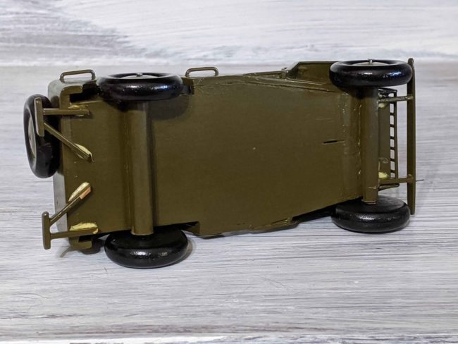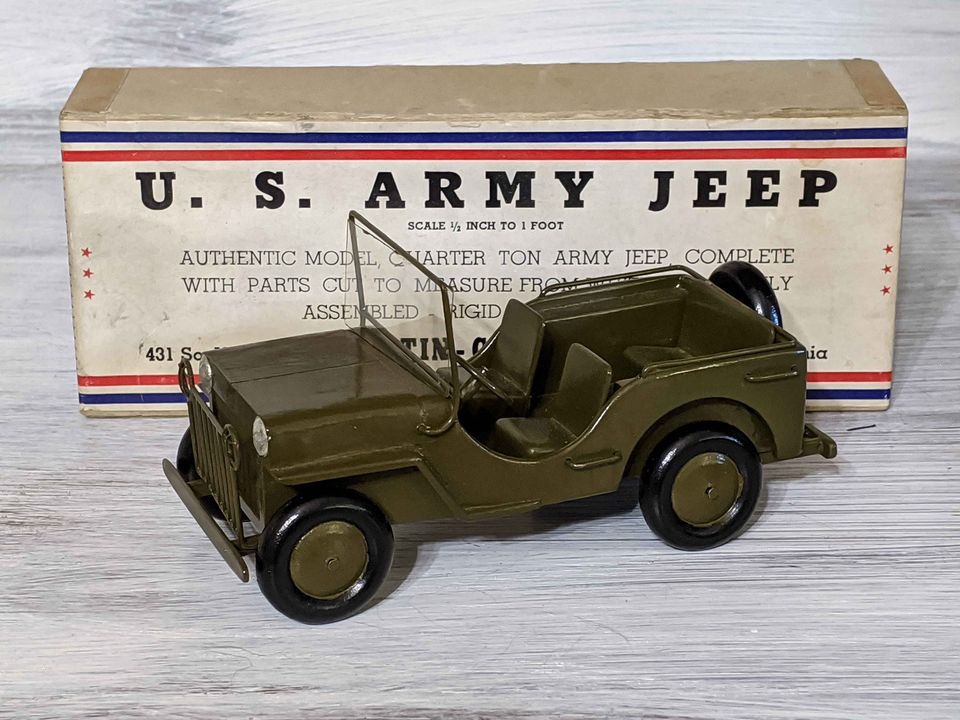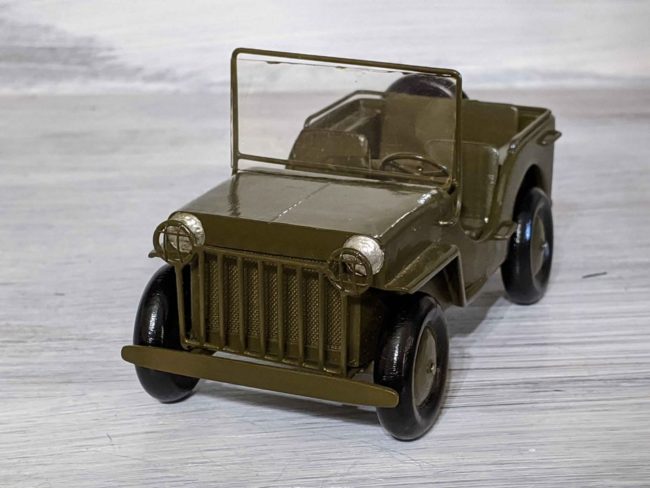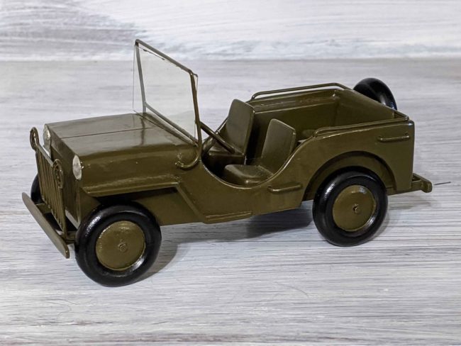 “Vintage 1940’s US Army Jeep Toy. This was a wood model assembled and painted very well. The windshield isn’t attached but kind of just sits on the frame. Awesome display piece.”