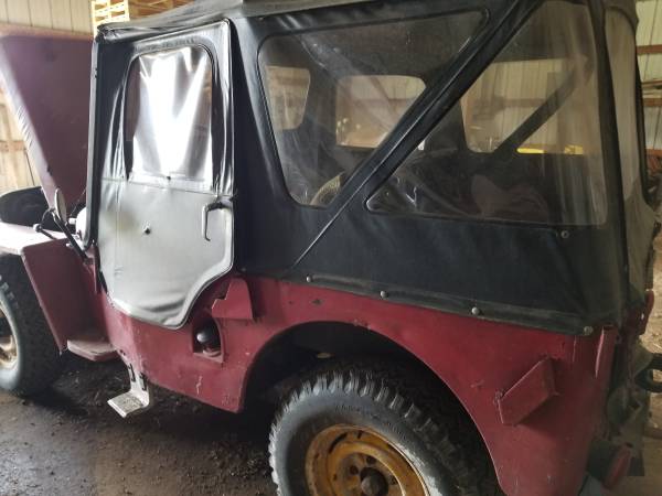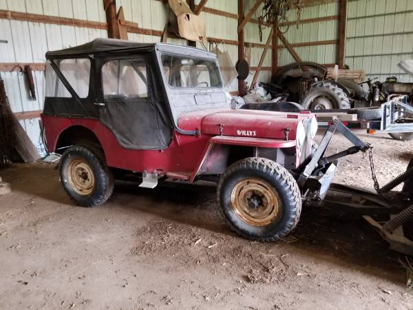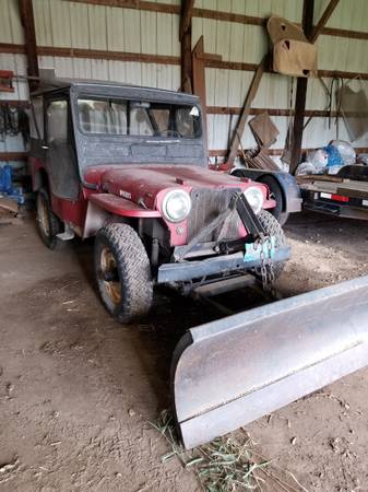 “1947 Willys Jeep with plow. Mostly original (except for tires). Not restored. Good condition. Unknown mileage. Stored indoors year around. Will negotiate. You pick up.”