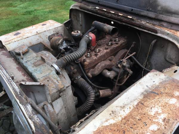 The jeep has a wooden body from the mid body seam to the rear (forward body is original metal). My dad bought a kit to make the wooden body from sears or montgomery wards many years ago. I assume he did this due to rust in the rear body floors. It’s done very well as the kit included supports and corners. The frame and other parts are solid and only have surface rust. I was going to get this going again and purchased a rare Koening hard top for it which I will sell seperately if the new owner desires it. Also the jeep includes a nice roll bar which is not installed.”