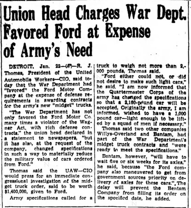 2. Ford gets Priority over Bantam for axles: This January 22, 1941, article in the Indiana Gazette notes a claim by the President of the United Automobile Workers–CIO that Ford was given priority over Bantam on orders for axles, forcing Bantam to miss its deadline for filling their order for the BRC-60s.