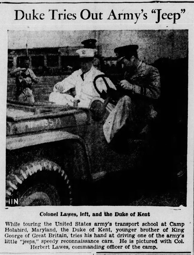 3. Duke of Kent: This photo shows the Duke of Kent riding in a Ford GP at Holabird, Maryland. The photo appeared in the Salem News (Ohio) on August 29, 1941:
