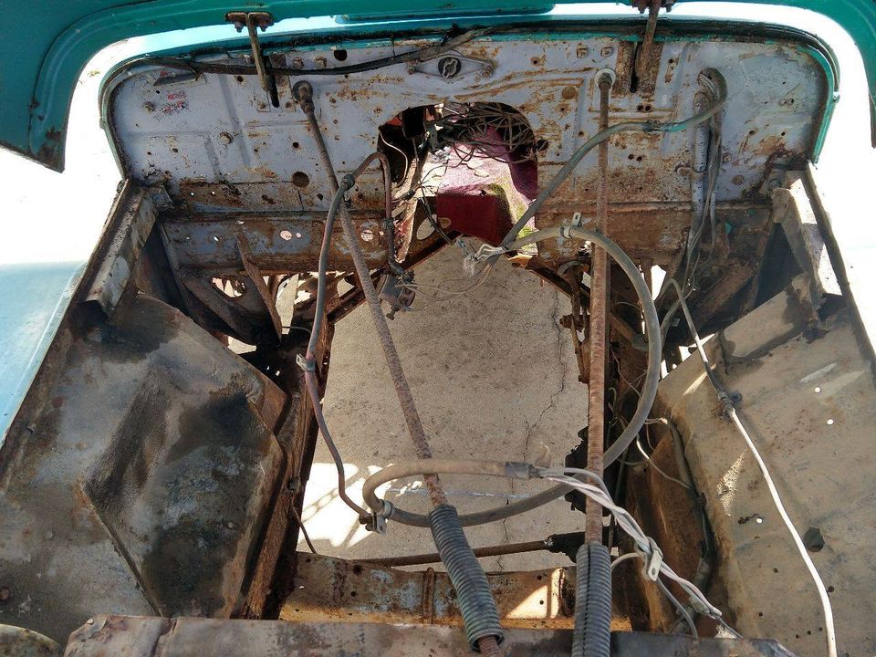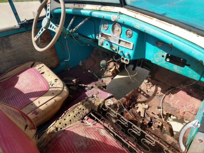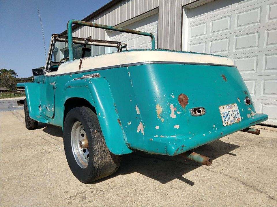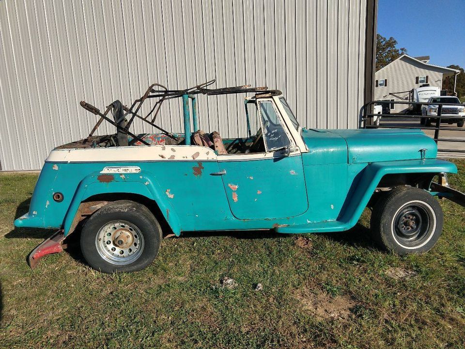 “1950 Willy’s Jeepster Roadster Convertible. Only made for 3 years. No drivetrain. Very rusty. Frame and floorboards are rusted through. Rat rod, yard art or parts car. It does have all chrome trim, front and rear bumper, filler panel, spare tire ring, top frame, gauges, glovebox. Lots of original parts”