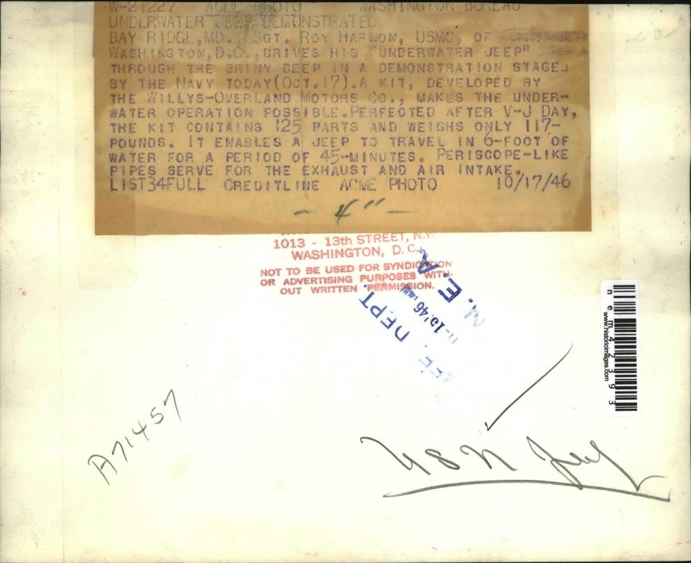 From the eBay ad: “1946 Press Photo Bay Ridge MD Sgt Roy Harmon USMC in underwater jeep. .This is an original press photo. Photo measures 9 x 7.25inches. Photo is dated 10-17-1946.”