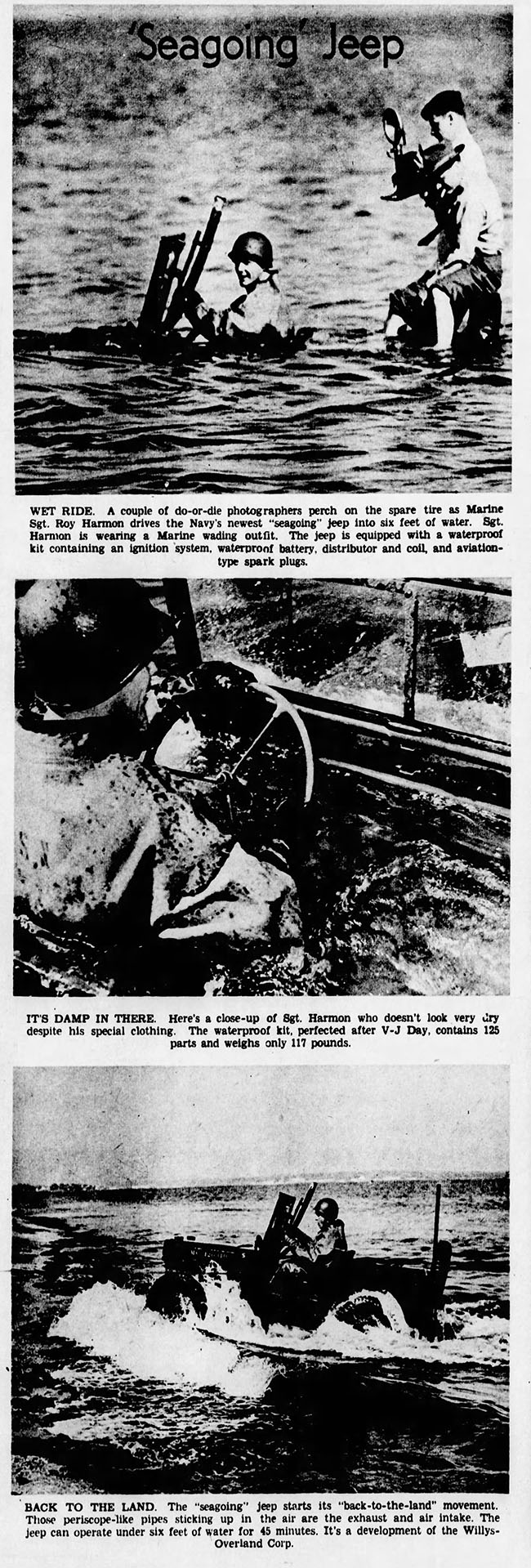 This series of three photos from the November 03, 1946, issue of the Pittsburgh Press includes one showing the jeep exiting the water:
