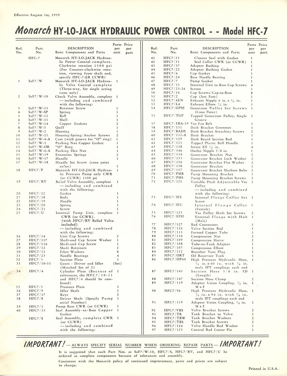 2. The next page covers the Monarch Hy-Lo-Jack Hydraulic Power Control Type HFC-5. It is dated August 01, 1959: