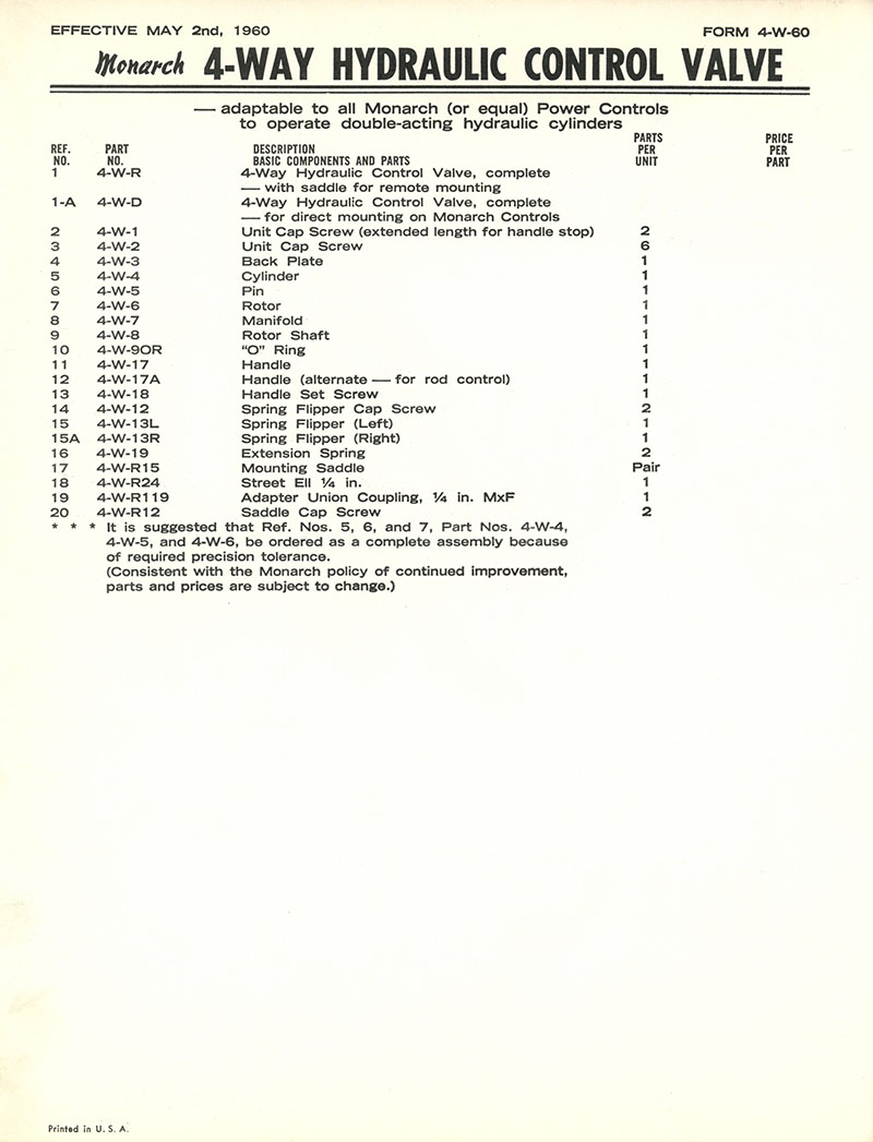 4. Dated May 2nd, 1960, this document covers the Monarch Hydraulic 4-Way Control Valve. It is Form 4-W-60: