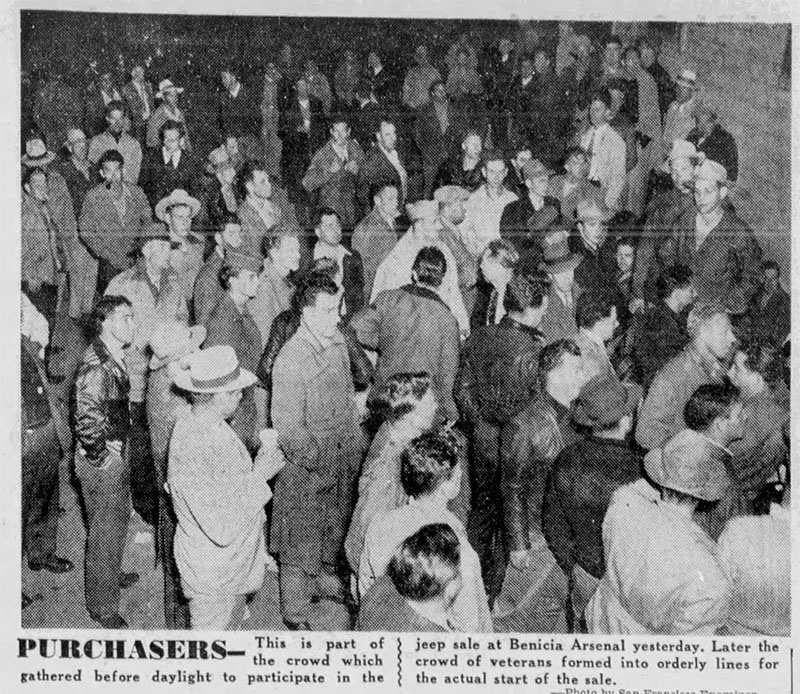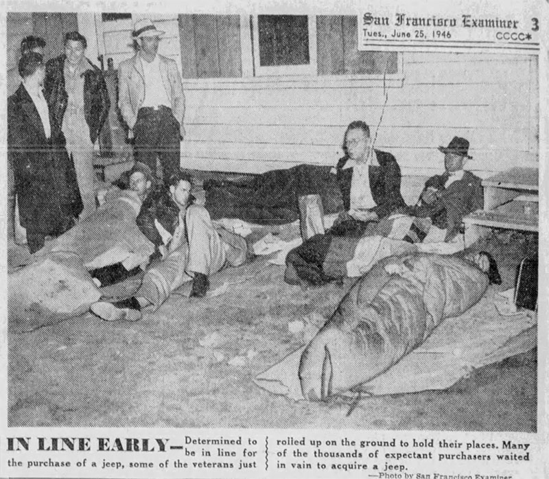 Originally published November 5th, 2020: The June 25, 1946, issue of the San Francisco Examiner shared the news that more than 5000 veterans lined up begining at midnight to purchase just over 1500 available jeeps, though not that many jeeps would actually sell. For most veterans, there multi-hour waits were in vain. The buyer of the first jeep discovered that his jeep wouldn’t start, but the motor pool helped him get it going.