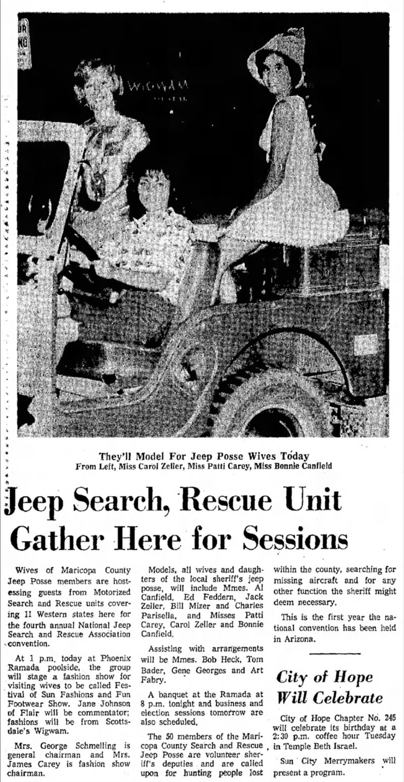 The Maricopa County Jeep Posse held the 4th Annual National Jeep Search and Rescue convention in 1963. As part of the event, wives and daughters of the Maricopa County Jeep Posse planned to pose as models for a pool-side fashion show. They would model clothes from the Scottsdale Wigwam. I can’t speak for the Scottsdale outlet, but I am just old enough to remember our local Wigwam store and ‘fashionable’ isn’t a word I’d use to describe it. It was more like the precursor to the Dollar Store.