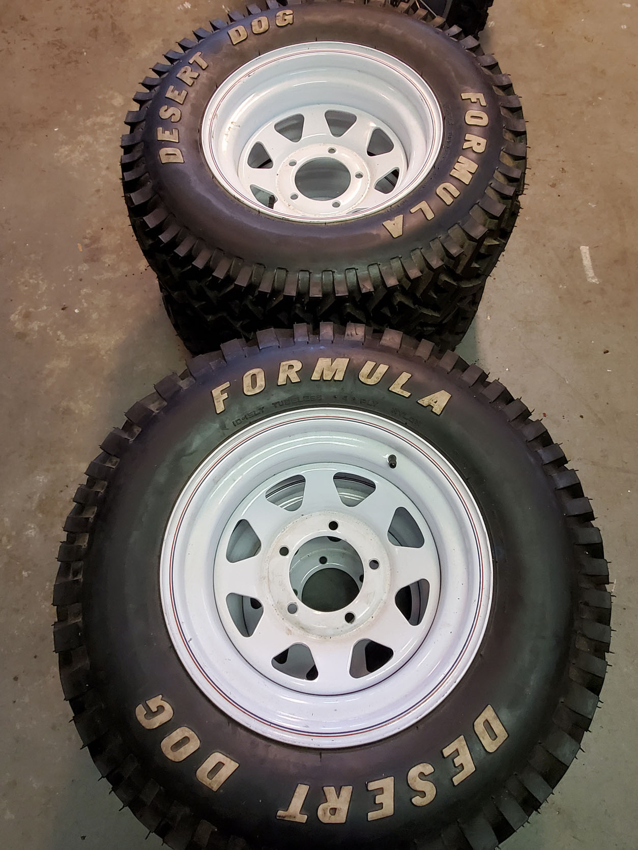 These are never-used 15″ x 30″ solid-letter Desert Dog tires. They come mounted on 8″x15″ white-spoke rims that appear in good shape, too.