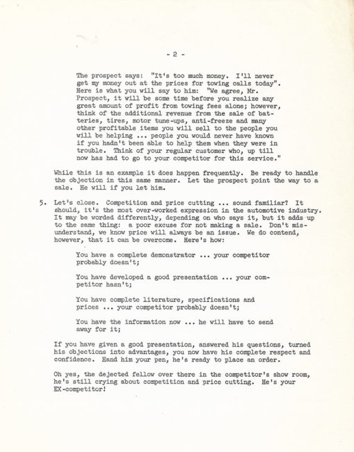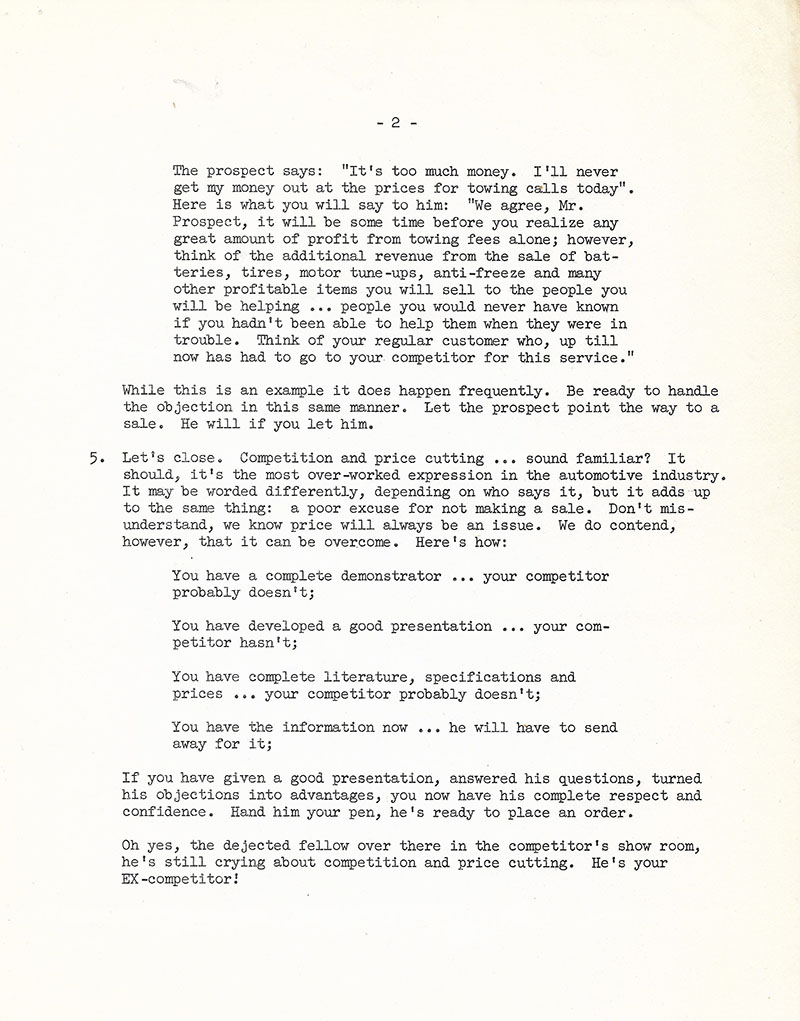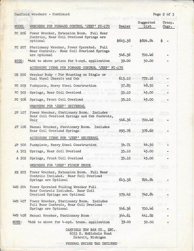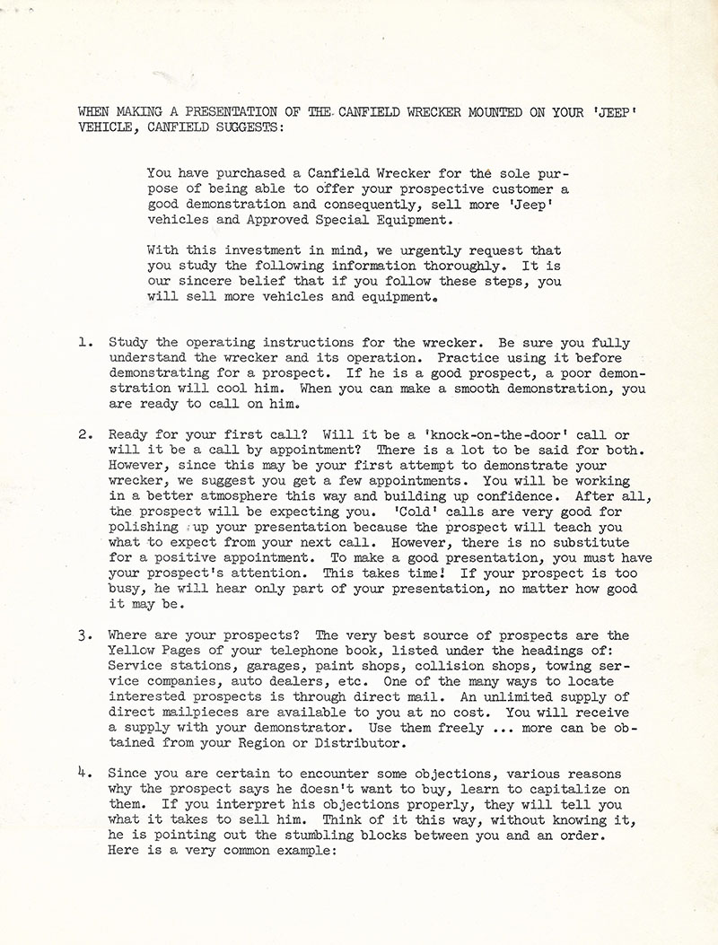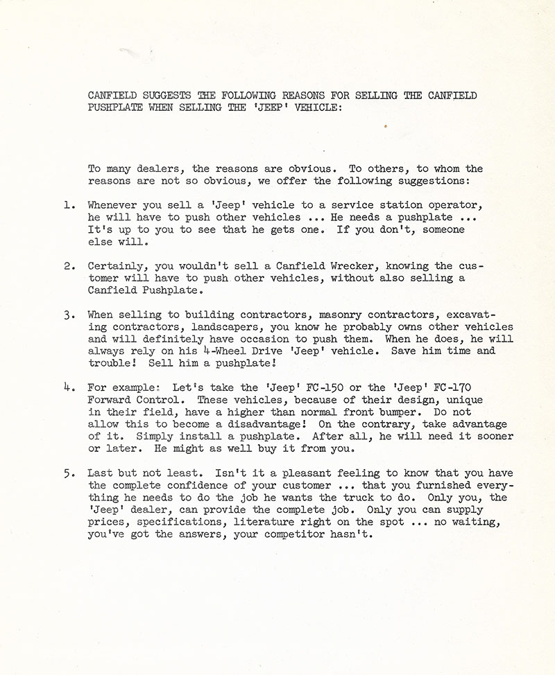 3. Additional Canfield information. Mike provided these bulleltins about how to sell the Canfield wrecker to prospects. These first two pages deal with incentives for Jeep dealers for installing Canfield wreckers.
