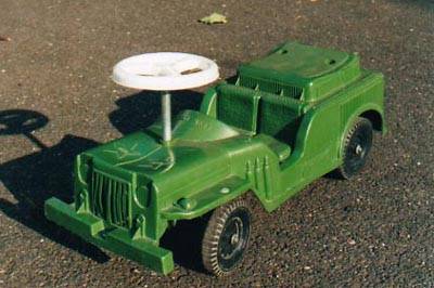 “Andy Gard Sit N Ride ARMY Jeep. Has 2-Stars on the hood,Steering wheel has ANDY GARD.