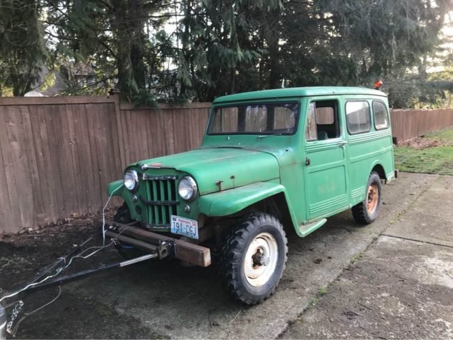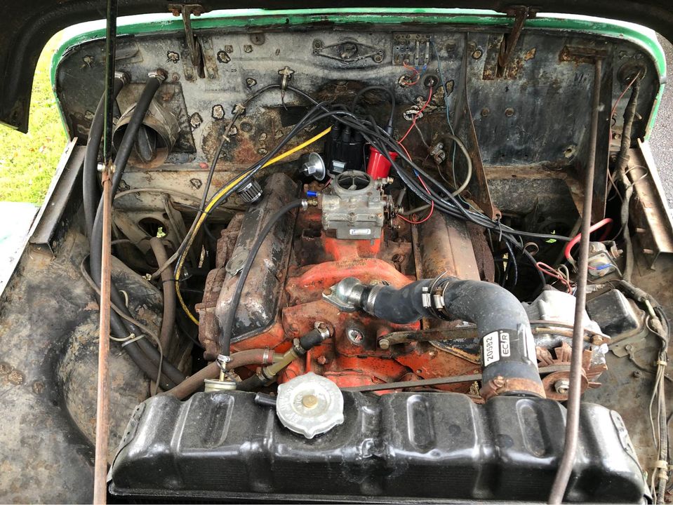 “1961 Willys wagon 4×4. 4 speed with a Chevy small block. Vehicle has been stored under cover for the last 5 years until recently. There is some rust shown in the pictures. Hasn’t ran in 3 years and the rear brake line is bad. Does come with a tow bar and lights. Here’s a little back story on the wagon. Researching the serial number from Kaiser/Willys website this was a 2wd drive naval personnel carrier that was built at the end of the Korean War but never left the factory.