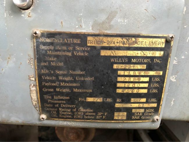 The seller has done some research, discovering that this started life as a 2×4 for the Navy, but was then was refitted to be a 4×4 for the Forest Service (perhaps the Parkway Conversion was also implemented at that time?) .