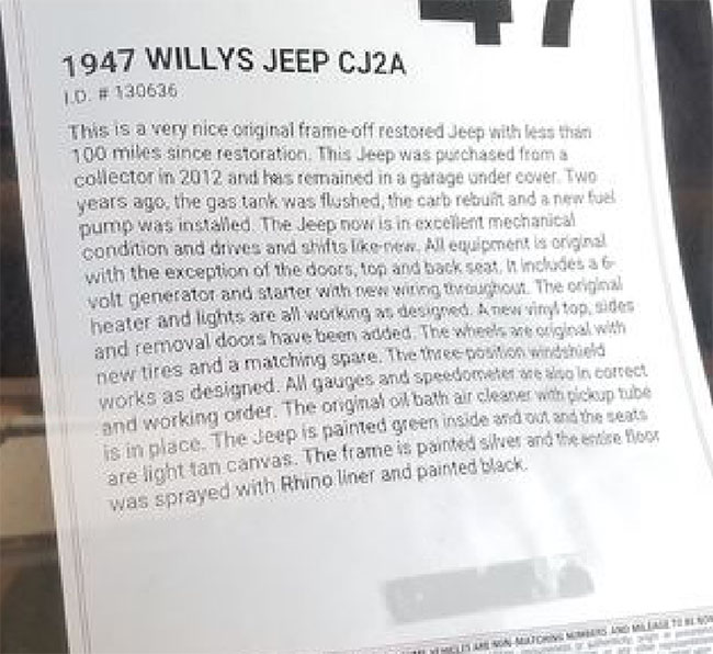 “1947 Willys Jeep CJ2A Vin: 130636 Cylinders: 4 Drive: 4 Wheel Drive Title: Clean Engine: Flathead 4”
