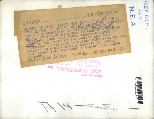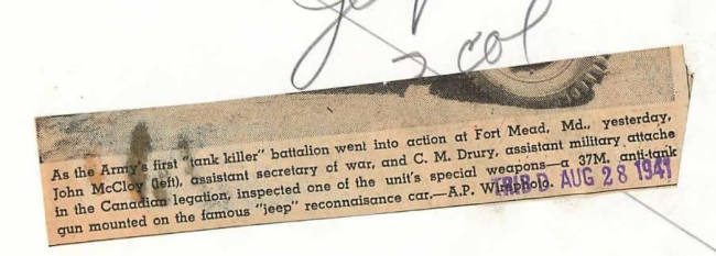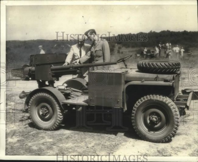 “1941- Assistant Secretary of War John McCloy inspects T2E1 37mm Gun Motor Carriage, mounted on the Bantam BRC-40 Reconnaissance Car and armed with 37mm anti-tank gun, at Fort Mead. Note: Only 11 of the T21Es Version 3s were reported to have been built.”