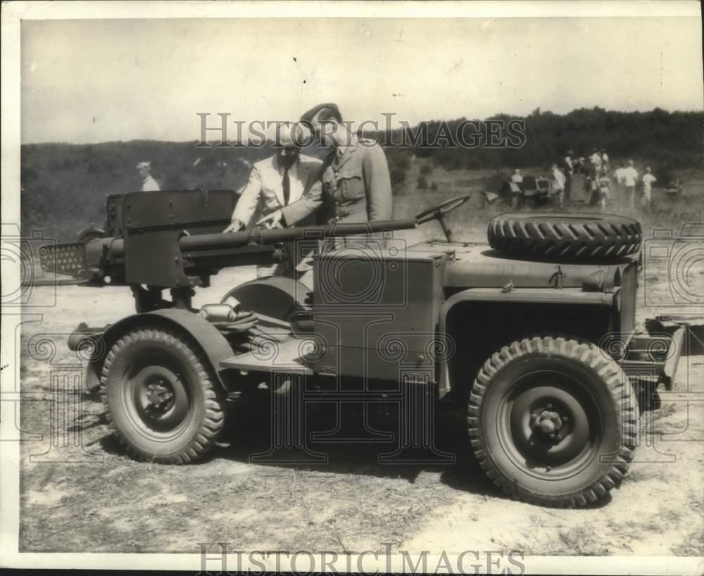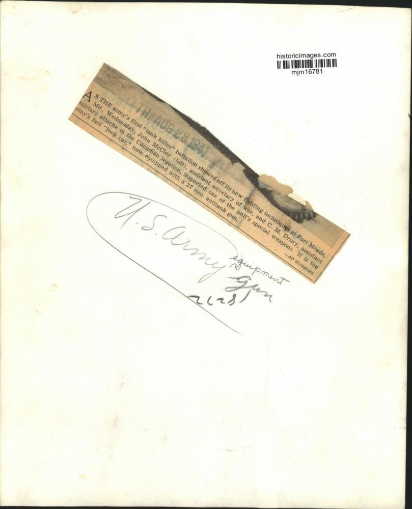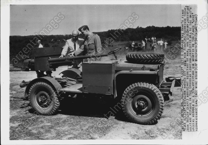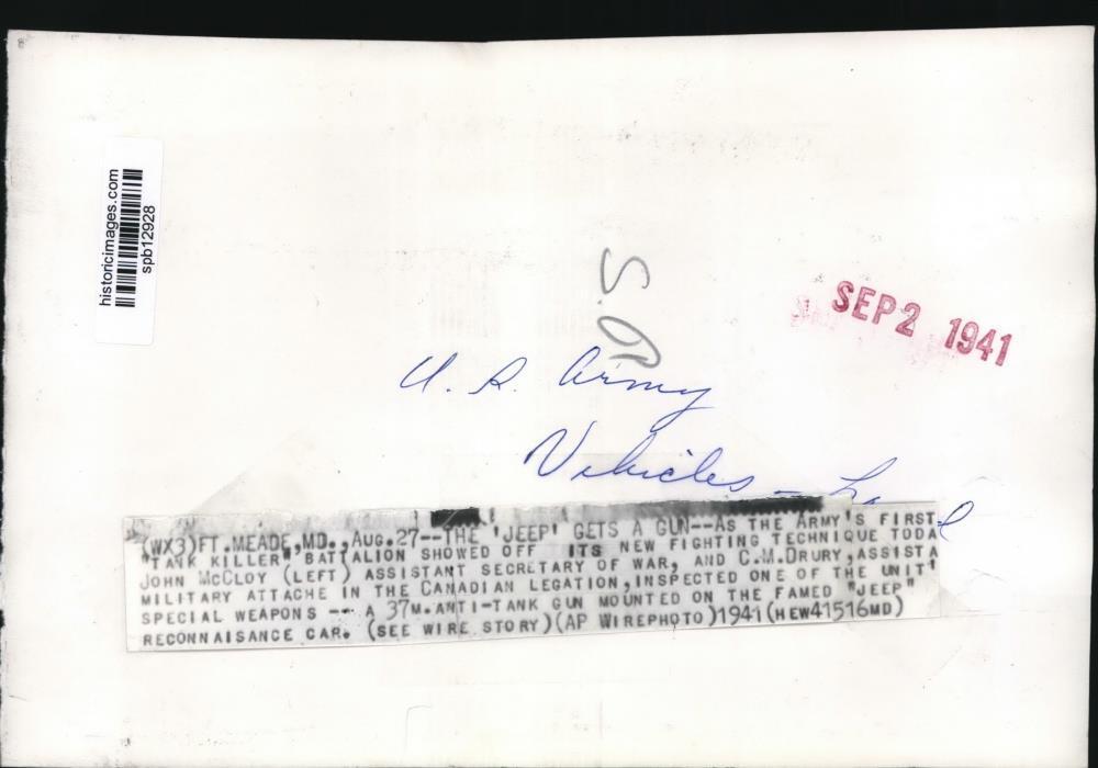 “1941 Press Photo The Army’s fast “jeep car” with anti-tank gun at Fort Meade. This is an original press photo. As the Army’s first “tank killer” battalion showed off its new fighting techniques at Fort Meade, Maryland, Wednesday, John McCloy, assistant secretary of war, and C.M. Drury, assistant military attache in the Canadian legation, inspected one of the unit’s special weapons. It is the Army’s fast “jeep car,” now equipped with a 37 mm anti-tank gun. United States Army – Equipment – Guns Photo measures 10.25 x 8.25 inches. Photo is dated 8-28-1941.