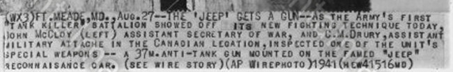 “1941 PRESS PHOTO WWII Army Jeep 37mm Anti Tank Killer Ft Meade MD 3571 Measures 7.5 X 9.5 inches”