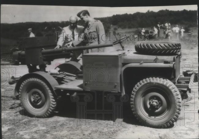 “1941 Press Photo John McCloy & C.M. Drury inspect a new gun mounted on a jeep. This is an original press photo. As the Army’s first “Tank killer” battalion showed off its new fighting technique today, John McCloy (left) assistant secretary of way, and C.M. Drury, assistant special weapons–A 37m. anti-tank gun mounted on the famed “jeep” reconnaissance car. U.S. Army land vehiclesPhoto measures 9.5 x 6.5inches. Photo is dated 08-27-1941.”