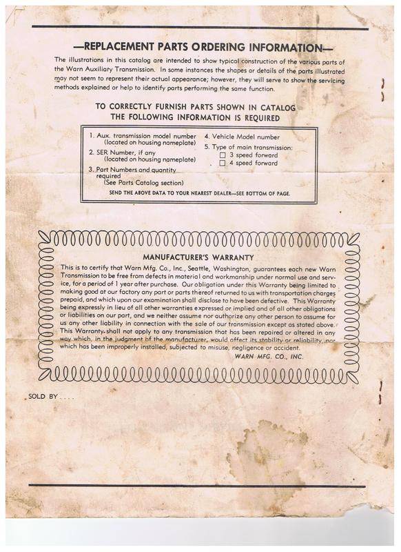 Blaine spotted a discussion at the Ford-Trucks.com forum on Auxiliary transmissions that included the rare Warn Auxiliary Overdrive. A user named “38 Coupe” shared a bunch of smaller Auxiliary transmission documents that included a Parts and Instruction manual for the Warn AO. So, here it is, along with some photos of a Warn unit that was for sale in April of 2015.