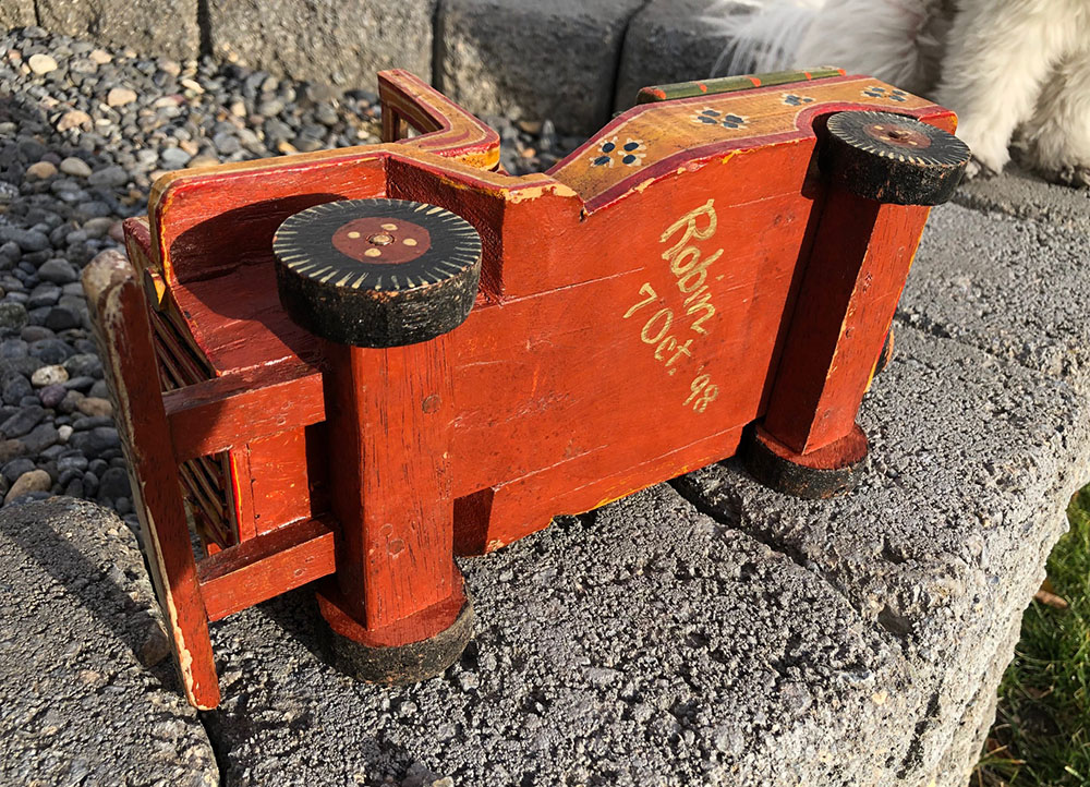 I bought this wood jeep on eBay. It’s solid wood with a good weight and some fun designs. One instription suggests this was made in India. A message on the bottom suggests this was purchased or completed on October 07, 1998, and was either for or from someone named Robin.