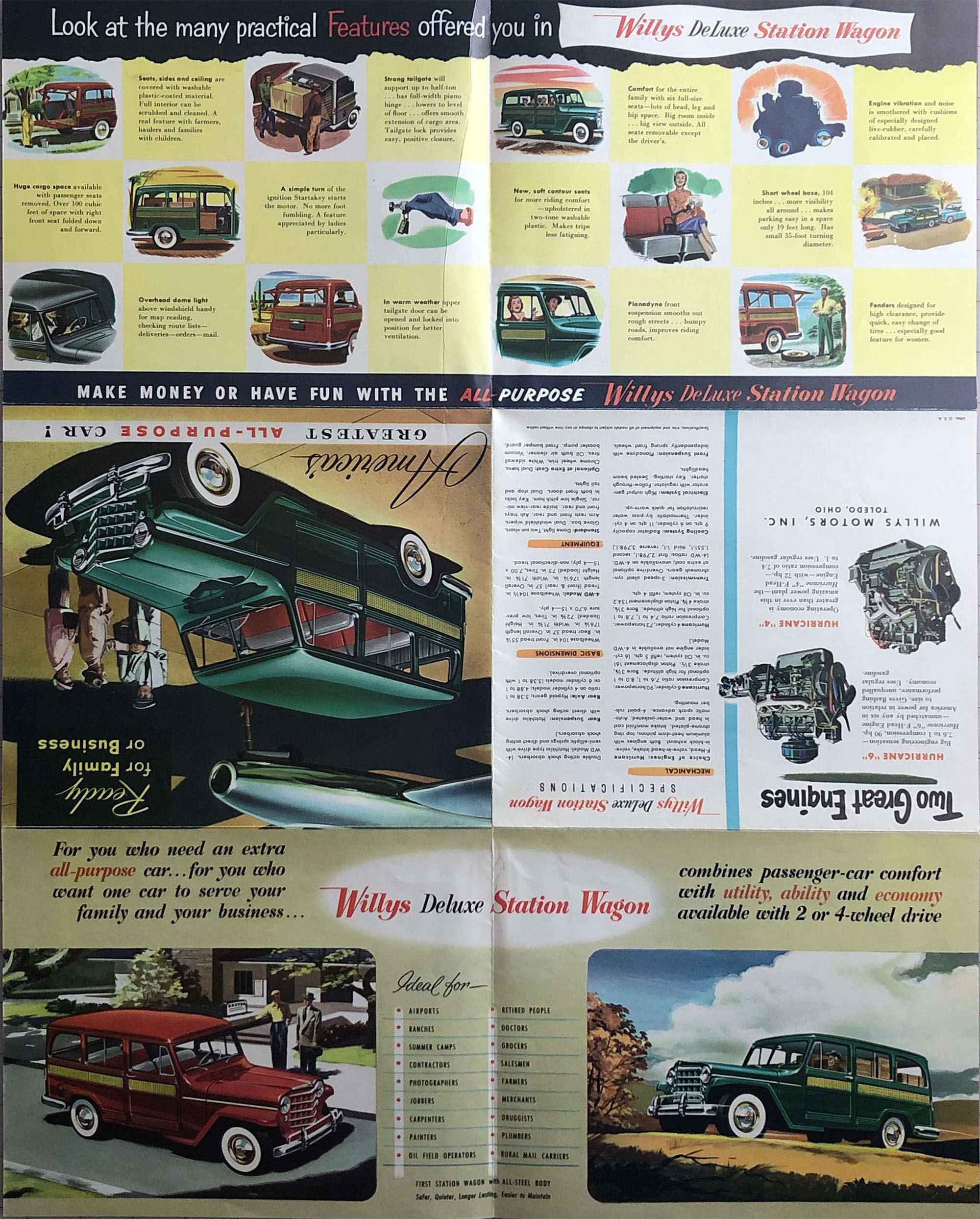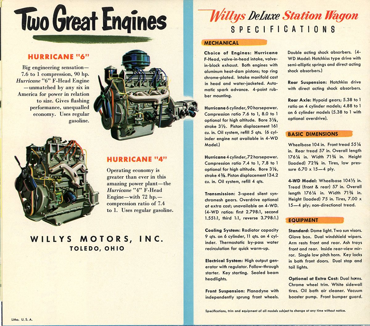 This brochure is probably for the 1953 Model Deluxe Station Wagon, since the F6 Hurricane wasn’t available until 1952. The 1953 Deluxe models had the basketweave appliques on the upper reliefs, they also had the three pointed hood emblem, two on each side and one back towards the windshield. We had a Luzon Red 1953 deluxe wagon in 1955-56, 4 cyl, with overdrive. My father survived a head on collision in that wagon with a Chrysler being driven by a woman who lost control and came across the center line and hit him. Had a grey/grey 1951 wagon with 4 cyl. and overdrive, came to Arizona from Illinois in it Jan. 1952.