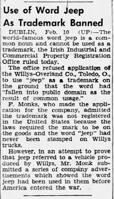 On February 11, 1945, the Pittsburgh Press shared the news that Ireland had ruled that the word Jeep could not be trademarked there. There were two reasons for that decision: 1) the word had not been stamped on the vehicle(s) and 2) the term ‘Jeep’ had fallen into public domain as a result of usage.