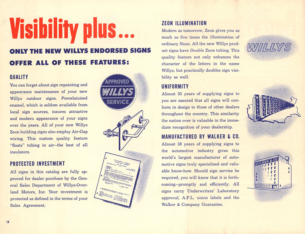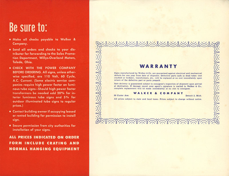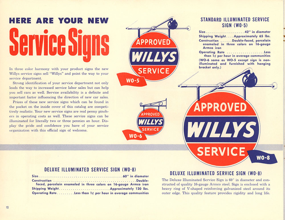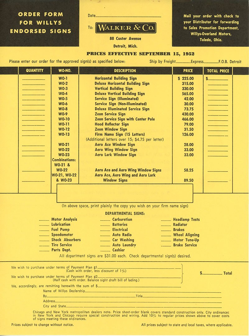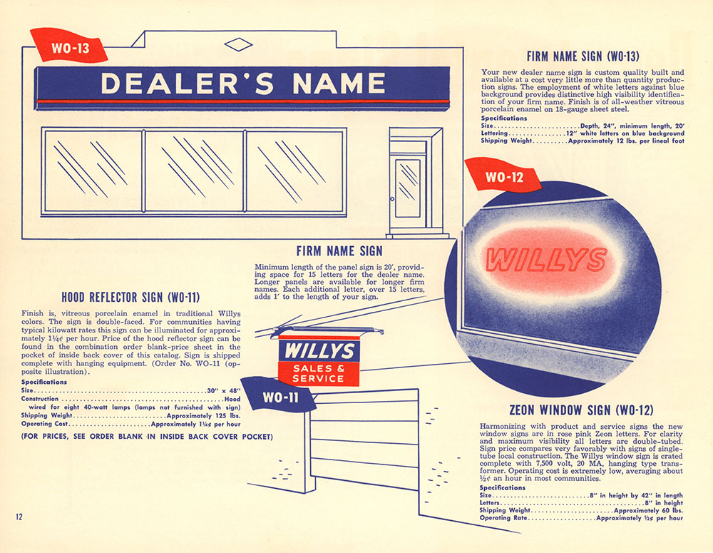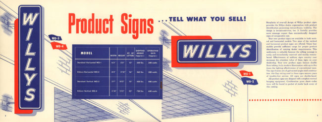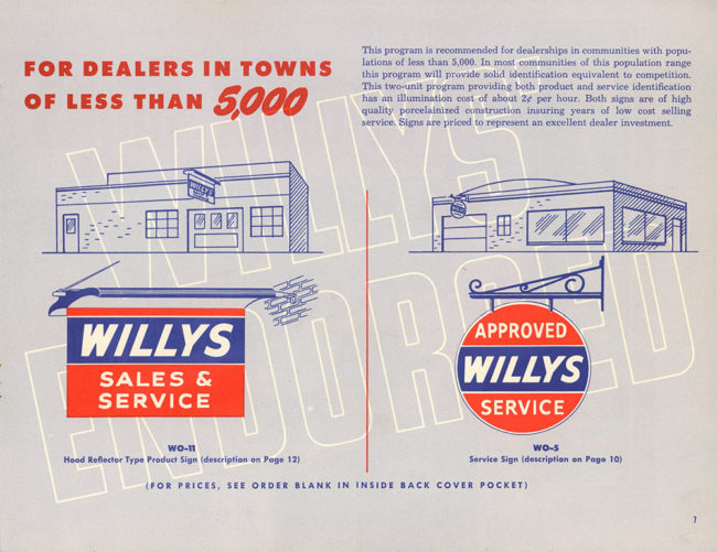 This rare 1952 brochure highlights the signage available for dealers and includes an order brochure. What you’ll notice is that there’s no reference to ‘jeep’ anywhere (unlike the 1946 brochure) and demonstrates Willys-Overland’s efforts to reduce the ‘jeep’ branding within the company.