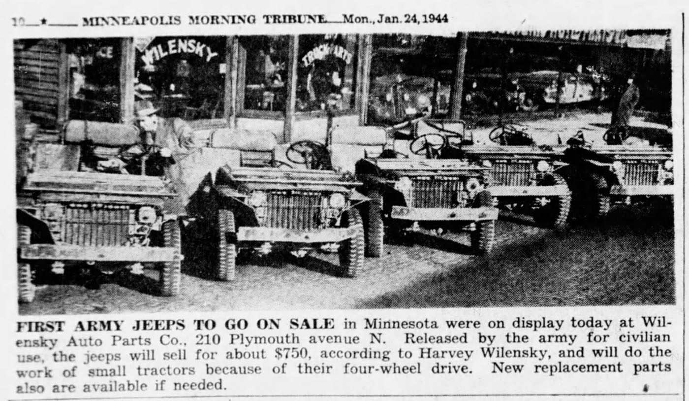 UPDATE: The press photo at bottom appeared in the January 24,  1944, issue of the Minneapolis Morning Tribune (seen below). It seems that Harvey Wilensky must have also won a bid for jeeps about the same time as Hyman Berg did.
