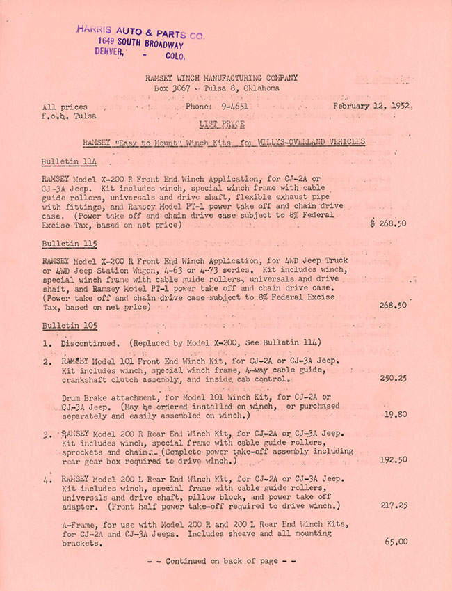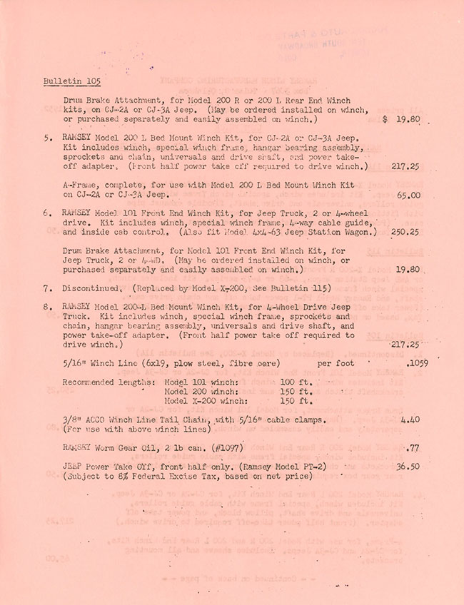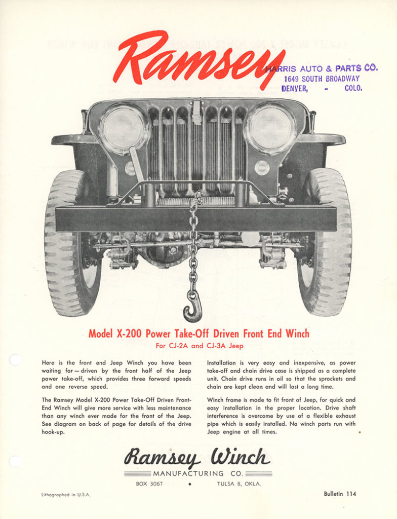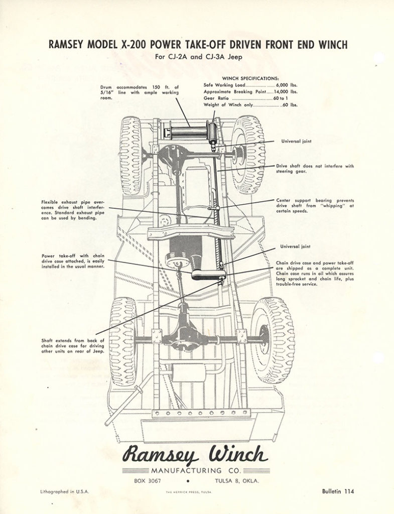 This Bulletin 114 from Ramsey Winch includes a good illustration of the underside of the jeep with a Ramsey X-200 PTO winch installed. A price listed was also included with the brochure. Below this post, you can see the truck and wagon brochure version of the X-200 winch.