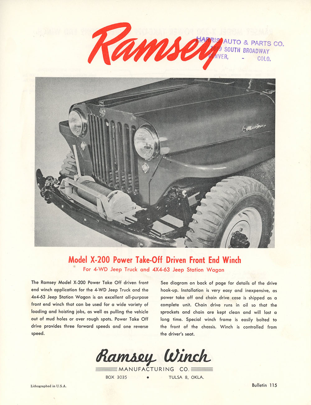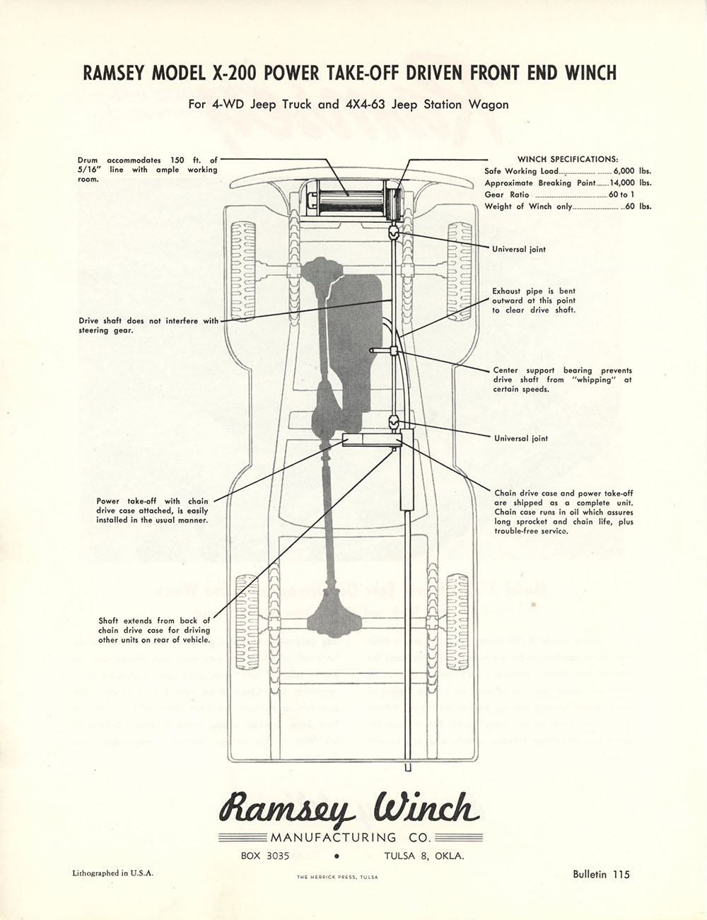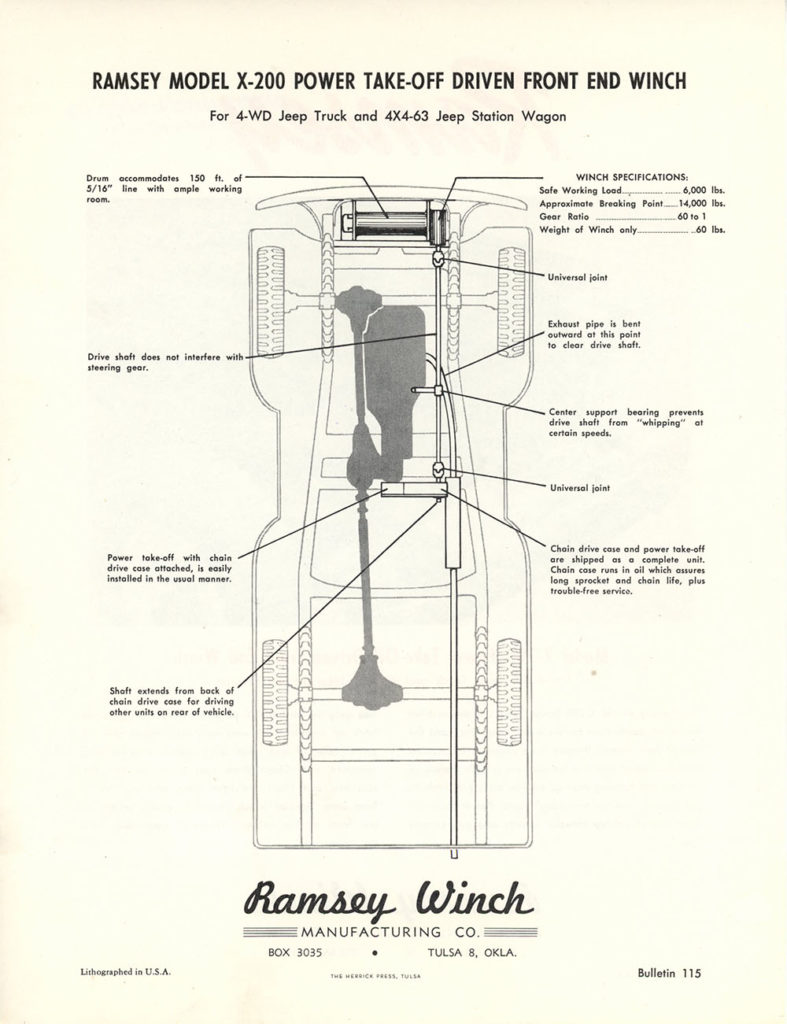 This is the same X-200 winch pictured in the post above, but setup to function on the longer wheel-base Willys Jeep trucks and wagons. The is Ramsey Bulletin 115: