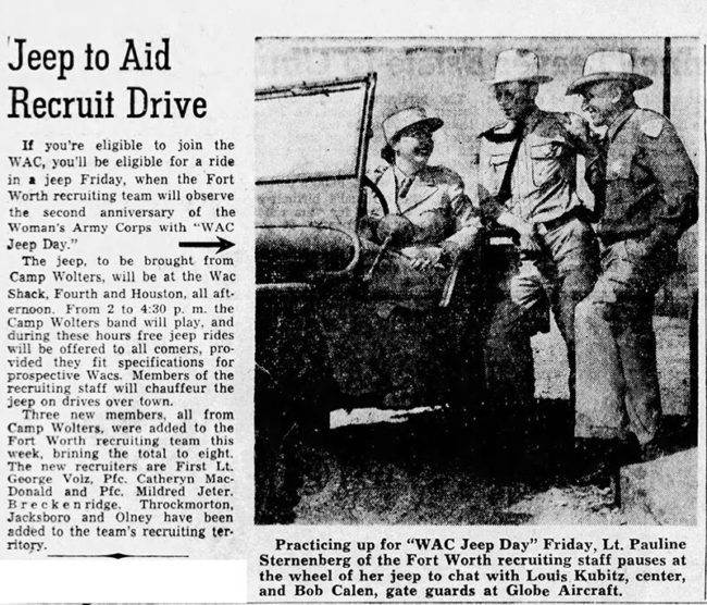 This May 18, 1944, article in the Fort Worth Star-Telegram describes the upcoming “WAC Jeep Day”. The Fort Worth recruiting team would offer free jeep rides to those women who fit the WAC’s specifications. I’m guessing the women had to be “U.S. citizens between the ages of 21 and 45 with no dependents, be at least five feet tall, and weigh 100 pounds or more.”