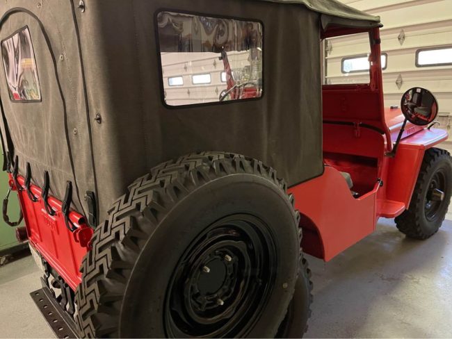 Was repainted in a satin fire red color and is a real head turner both on and off the road. As you can see from the pictures, all restoration components were carefully selected to be vintage OEM pieces and the work was done to keep the vintage feel of the era. The jeep includes 1/2 doors with canvas uppers (not pictured) and a full canvas top (as shown).