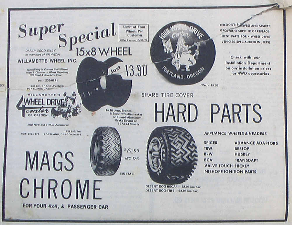 The TriPower newspaper was started during the year Jim Carter, of the Wandering Willys, was president of the PNW4WDA. It was his wife Patti Carter who came up with the name (and it was both of them that came up with my name In 1965, but that’s another story). The Four Wheel Drive Center, which paid for this ad, was a well-known Portland offload outlet that had a unique mascot.