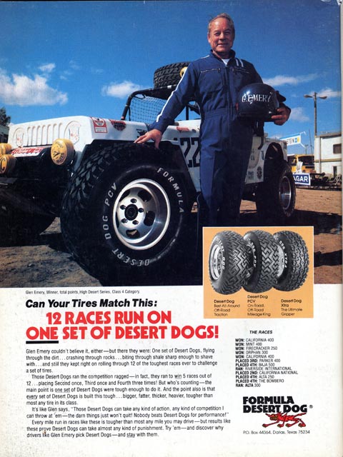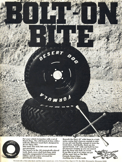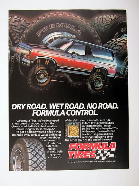 Eventually, the Formula brand was sold to Armstrong and the new owner made some Desert Dogs (as seen in the back left of the ad below). The company also sold other non-Desert Dog Formula tires, as this 1987 ad from Four Wheeler highlights::