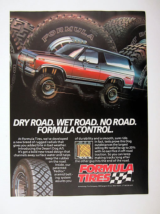Eventually, the Formula brand was sold to Armstrong and the new owner made some Desert Dogs (as seen in the back left of the ad below). The company also sold other non-Desert Dog Formula tires, as this 1987 ad from Four Wheeler highlights::
