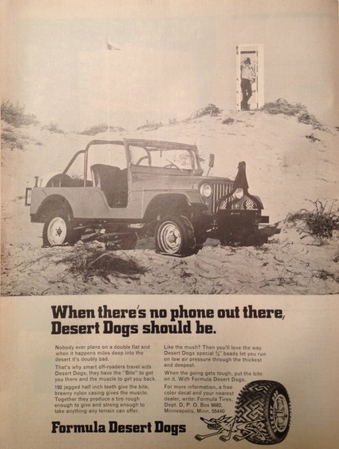 From the very first issue of the PNW4WDA TriPower Newspaper in September, 1974, Desert dogs played a role. This advertisement was an advertisement for both new and recapped Desert Dogs. Thanks to Mitch and the WWJC Scrapbook for this find!: