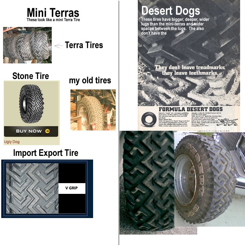 Over the years, some folks have confused these Mini-Terras and Desert Dogs. Mini-Terras, were referred by that name due to their similarity with Goodyear Terra Tires. They were also called other names such as mini-terrors, trail-blazers (see Fullerton Tire ad near top of this post), among other names, including most recently, recaps called Ugly Dogs.