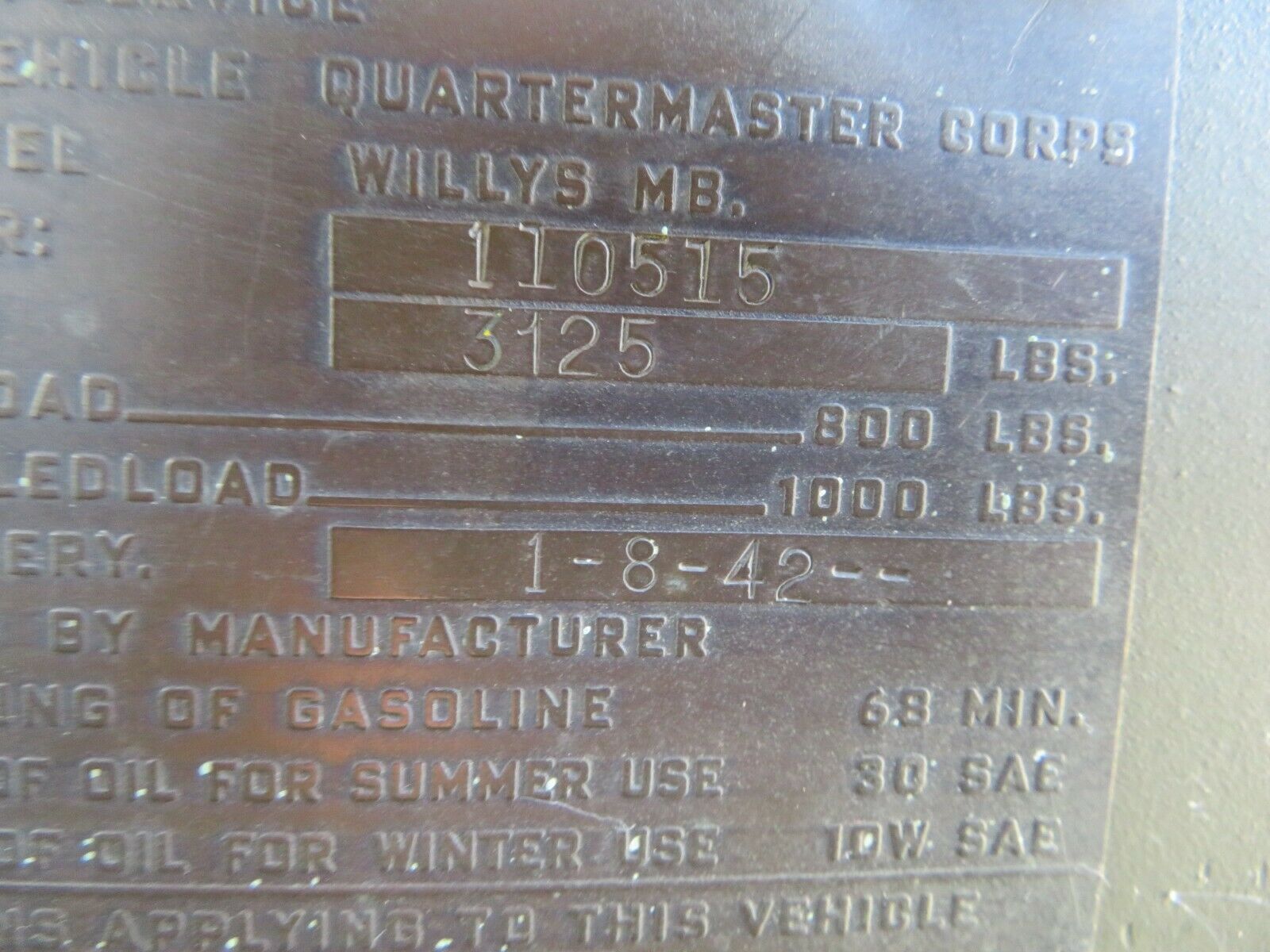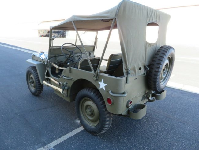 “1942 Willys MB Jeep built 1/8/1942. The serial # is 110515, frame # 110515, engine # MB595247. This Jeep was restored 18 years ago and driven 20 miles since. The Jeep has the original metal and Tub with some rust in the forward hat channel and a dent behind the passengers seat (see photos). The engine starts easily and runs very well, the transmission works as it should. The transfer case works correctly but is dripping some oil. All gauges work except the fuel gauge. The tires are as new and the brakes are very good. All electrical is working except the horn. Correct dish wheels. This Jeep has the correct steering wheel, the later WWII jeeps had the steel spoke wheels to save rubber.