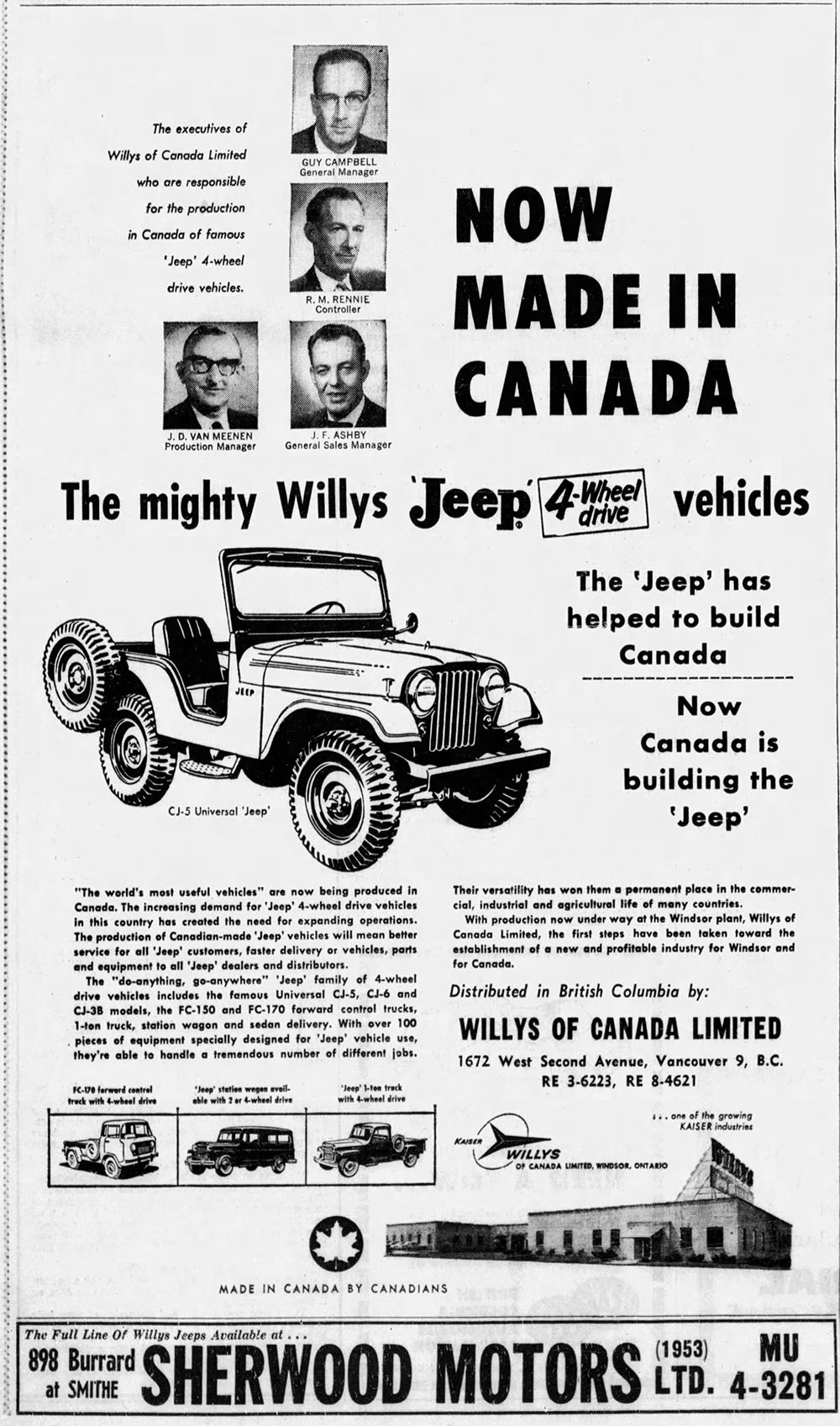 On August 21, 1959, the first Canadian-built jeep, a CJ-5, rolled out of the assembly plant in Windsor, Canada. Below are two articles and one advertisement that celebrates the acheivement.