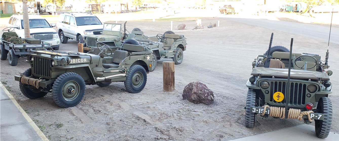Friends’ jeeps and a mule (far left) parked for the dinner and presentation on Friday night about the WWII Desert Training Area by a Yuma Proving Ground museum curator.