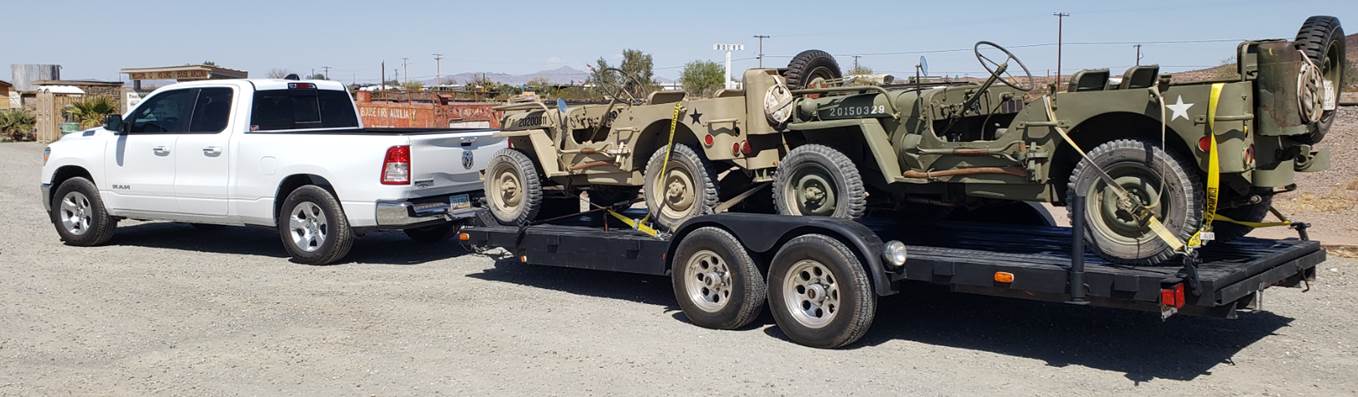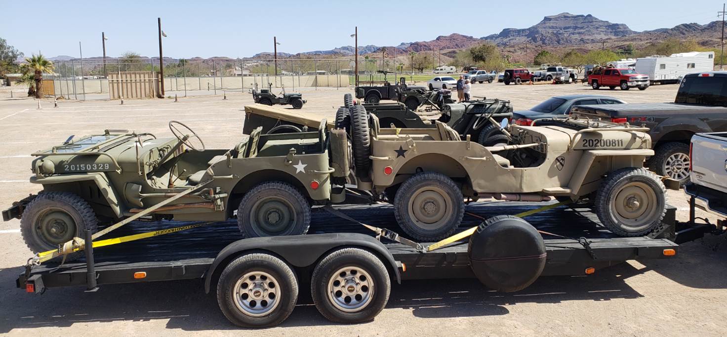 Here is a rest stop pic of the convoy to Parker with us up front (first time towing BOTH my WWII jeeps – new truck and trailer) and my friend David Webster with his MB and trailer.