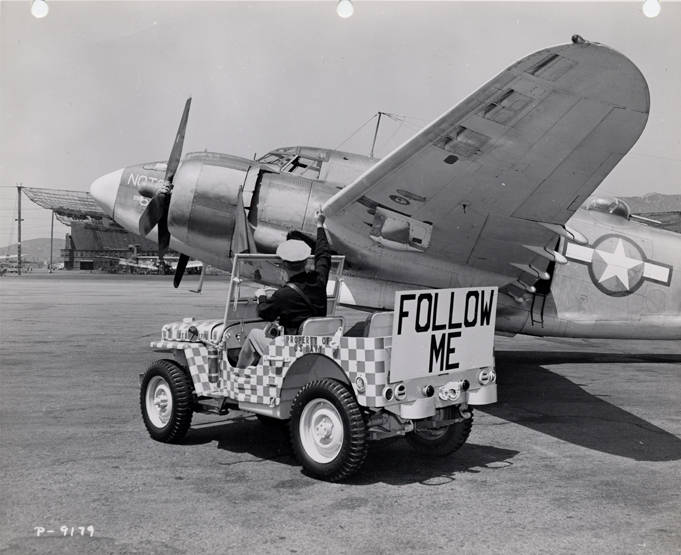 This photo shows Police Chief Schrage in the new Burbank airport “Follow Me” jeep used for the escort parking of aircraft. The aircraft in front of the jeep is a Lockheed Hudson, also known as a Lodestar. Note the camouflage in background. The photo is an 8 x 10 in. black and white photograph.