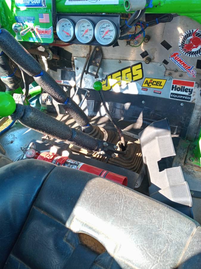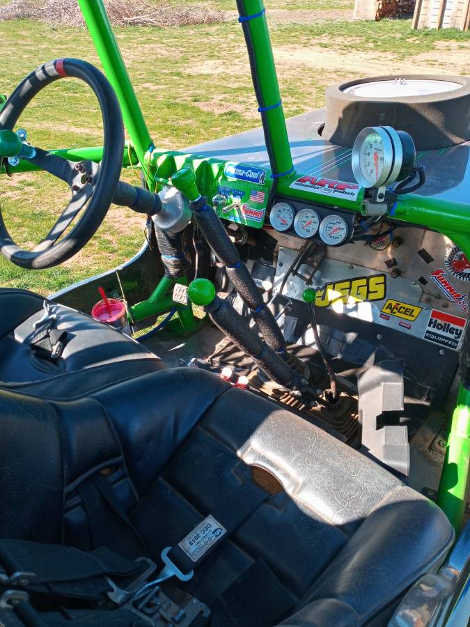 THE GREENHOUSE GAS ELIMINATOR — sbc , holley double pumper mechanical secondarys , ferd top shift , dana twenty , jeepster commando frame , plastic chinese body , dana 44 magnums , dopey ” woodys driveshaft bumpersticker ” , no speedo , not street legal , substantial roll cage , windshield delete , nut behind the wheel ..